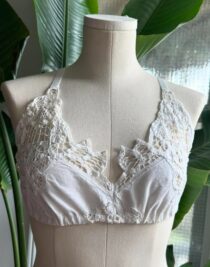 A delicate cotton bralette featuring exquisite Battenburg lace trim and detailing. Lightweight, soft, and feminine, this piece combines artisanal lacework with a comfortable, flattering silhouette