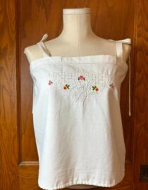 This Flower Garden Cross Stitch Camisole is adorned with charming hand-worked floral embroidery, reminiscent of a blooming cottage garden. Fine cross stitch details scatter across the fabric, bringing softness and color to the airy silhouette. SOLD