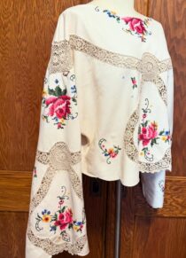 A romantic heirloom top adorned with hand cross stitch embroidery and delicate tatted lace on antique linen.