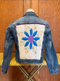 This one-of-a-kind jean jacket features hand-stitched 1930s quilted floral appliqué, carefully applied to celebrate the beauty of vintage textile work. Vibrant cotton florals and hand quilting to create a wearable heirloom that blends utilitarian workwear with delicate, timeworn craftsmanship. $110