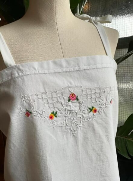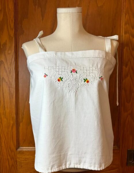 Delicately crafted in classic whitework, this camisole features intricate floral cross-stitch embroidery accented with a charming shamrock motif. SOLD ![]() ![]() |