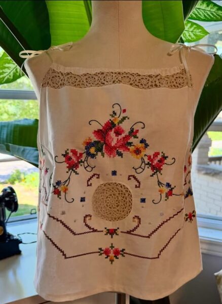 A romantic heirloom top adorned with hand cross stitch embroidery and delicate tatted lace on antique linen. ![]() |
