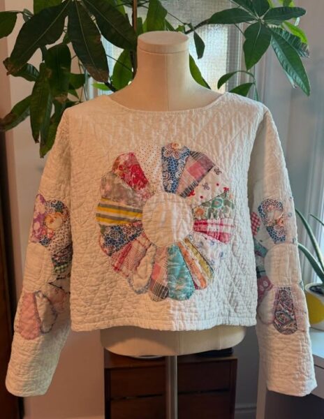 Dating to the 1940s, this Dresden Plate Quilted Top showcases a beloved quilt pattern rendered in period cotton prints. Time has softened the colors and textures, resulting in a beautifully worn surface that speaks to decades of use. Hand quilted and rich in character, this piece blends textile history with effortless wearability. SOLD ![]() |